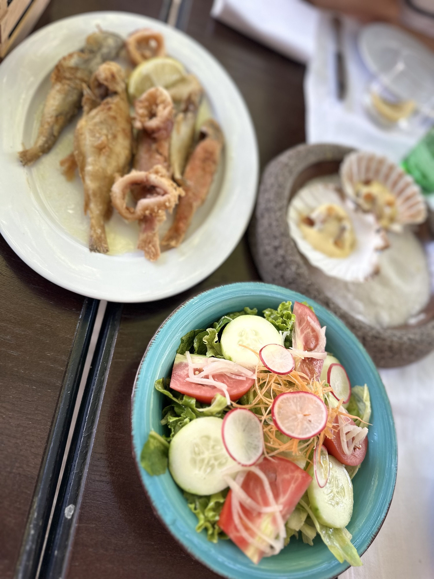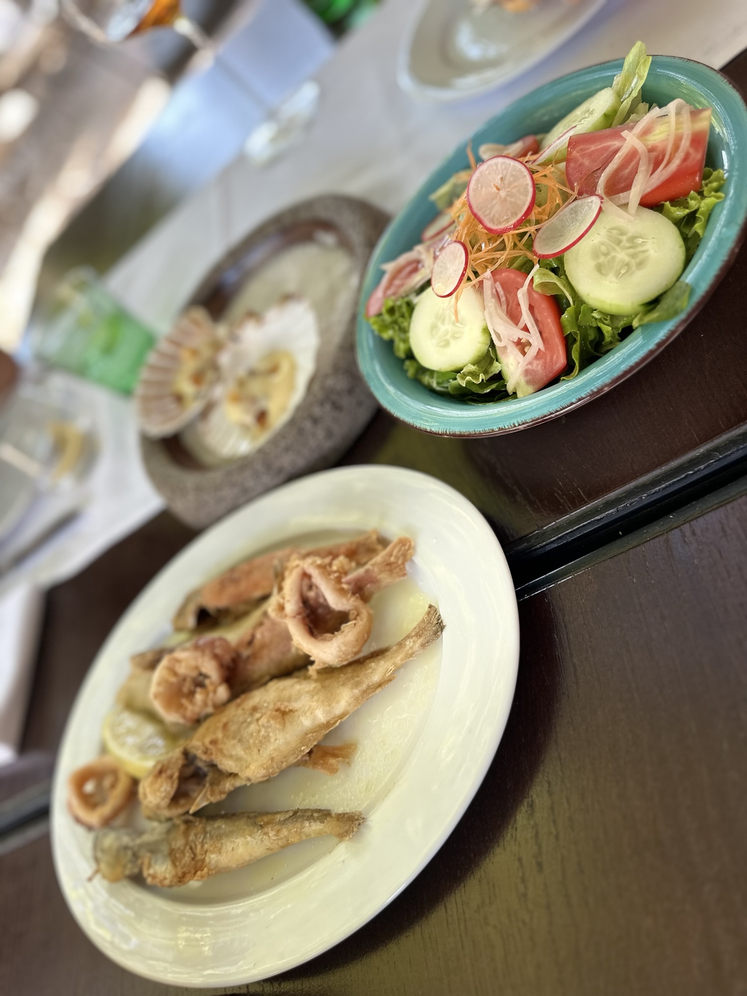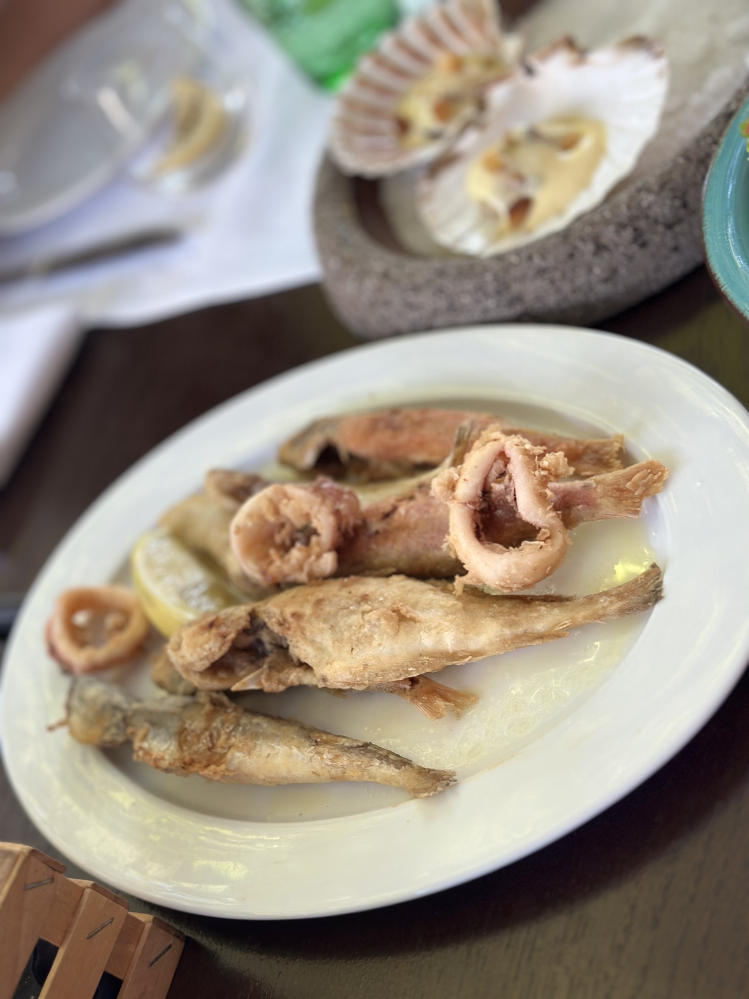 Continuing our experience with a delicious trio of Saint Jacques & sauce Hollandaise with croutons glazed in burnt butter – a sweet, savoury and crunchy delight. Next, a platter of fritto misto to engage our picky teenager. I had to try the Boškinčić cuvée between courses, a delicious, fresher, and more direct expression of the Boškinac cuvée — a blend of Merlot and Cabernet Sauvignon.